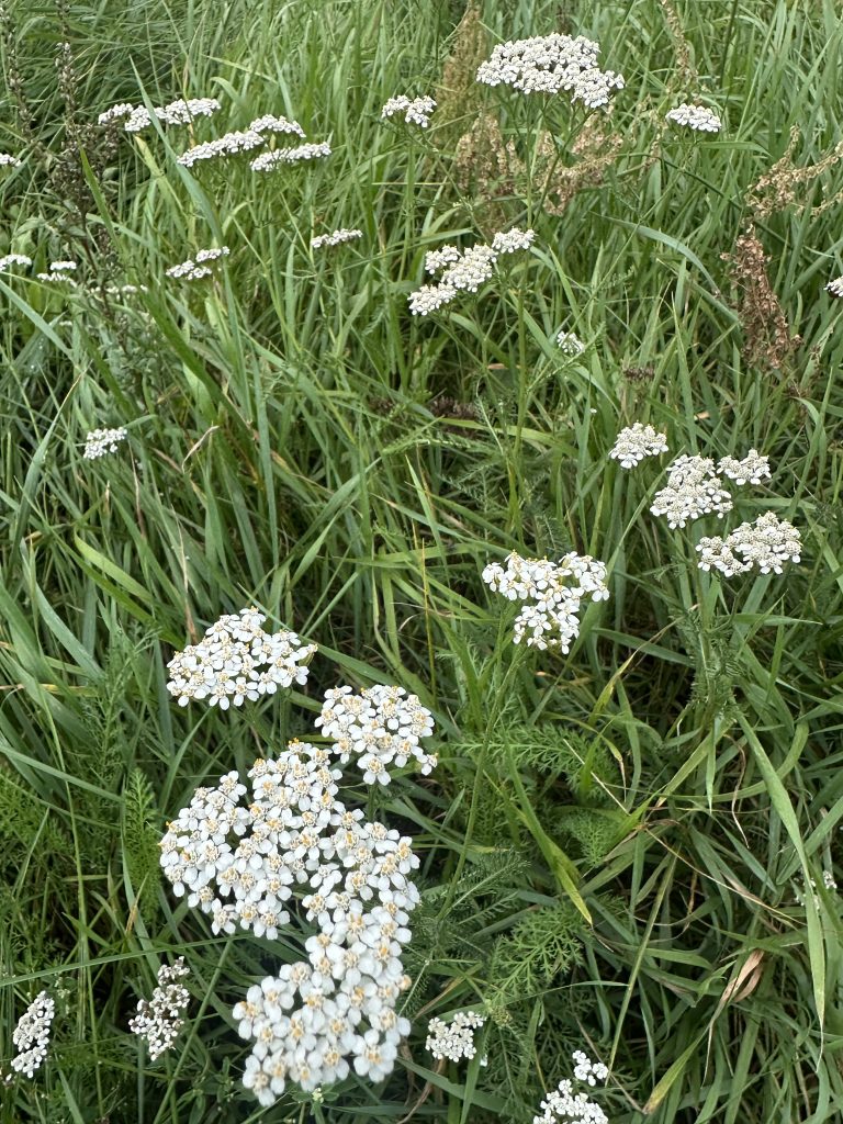 Meine Lieblingspflanze. Meine Wegbegleiterin: die Schafgarbe. Auch sie ist oft und an vielen Orten vertreten und wächst in den Wiesen am See. Die schicken weißen Blüten erschienen Doldenförmig – sind es aber nicht. Und die Blätter sind aufregend gefiedert: wie eine Venusaugenbraue heißt es. Von ihr habe ich immer ein großes Glas getrocknet im Teeschrank. Und spätestens bei der nächsten Periode wandert der dann ins Glas. Die Schafgarbe ist nämlich eine tolle Frauenpflanze. Und kann nicht nur bei inneren Blutungen ausgleichend einwirken, sondern wohl auch bei äußeren.